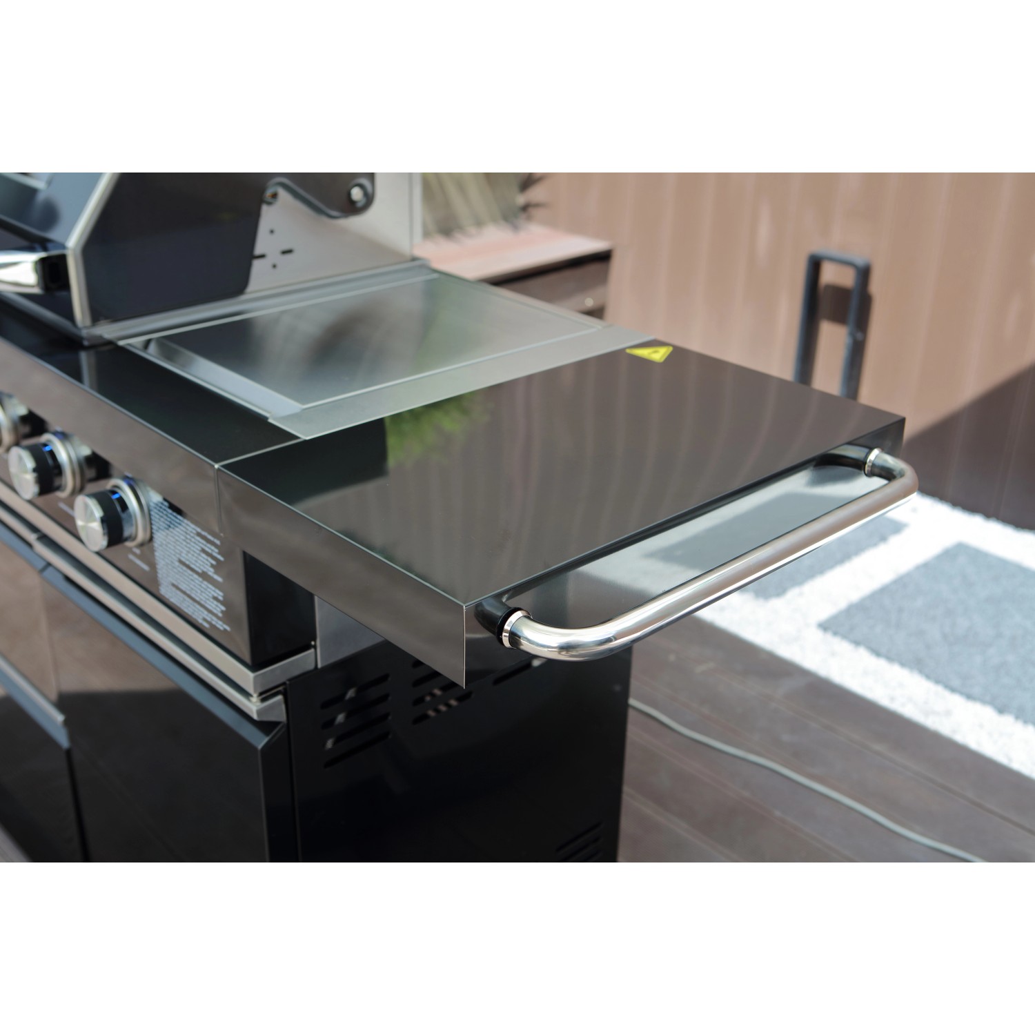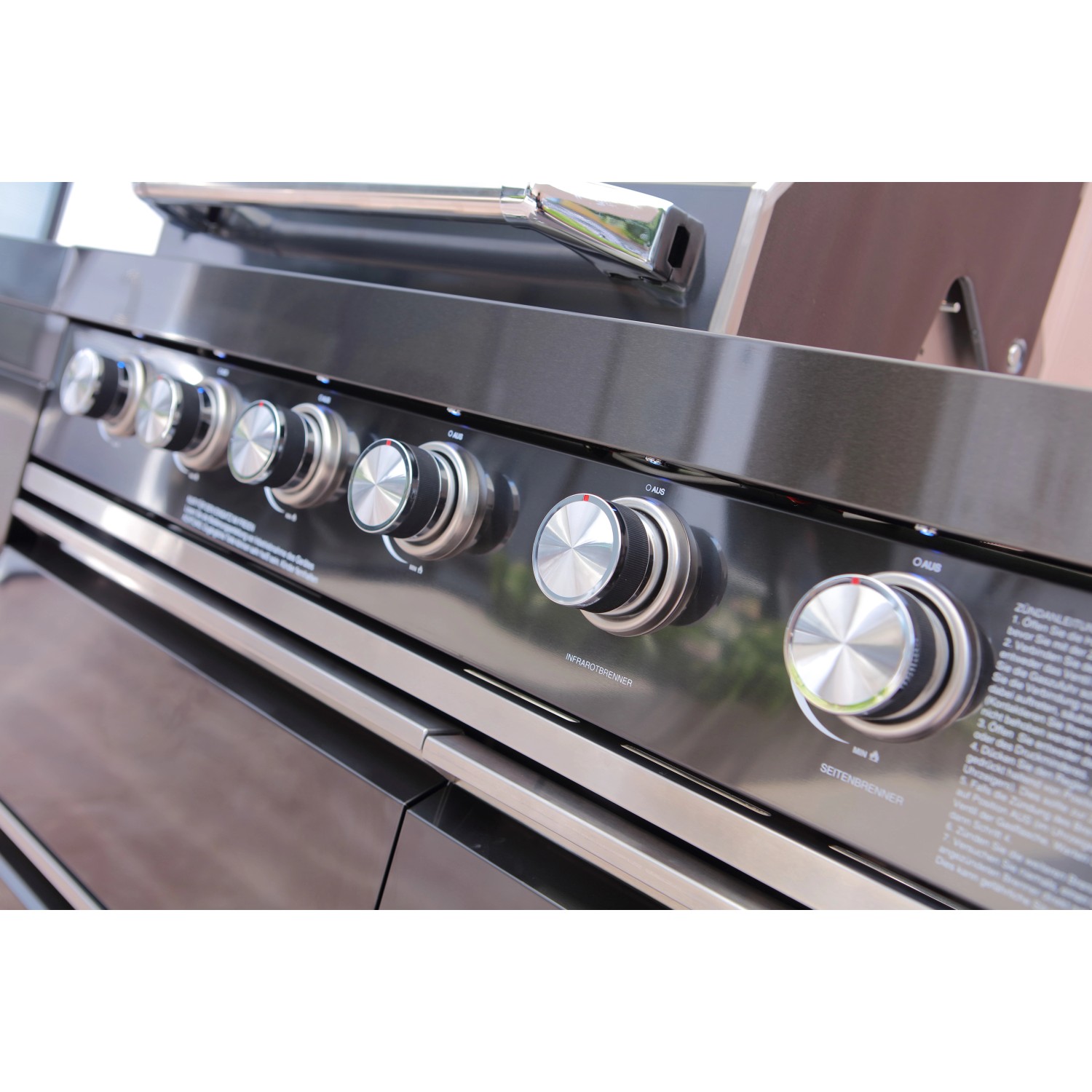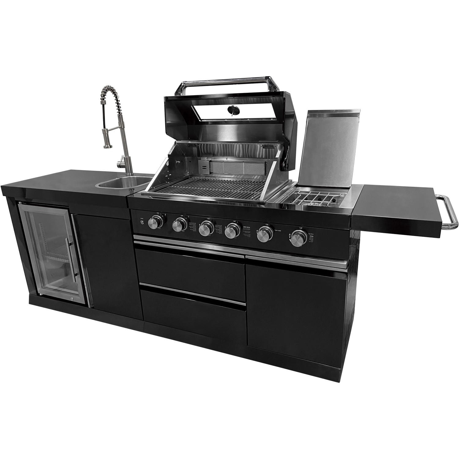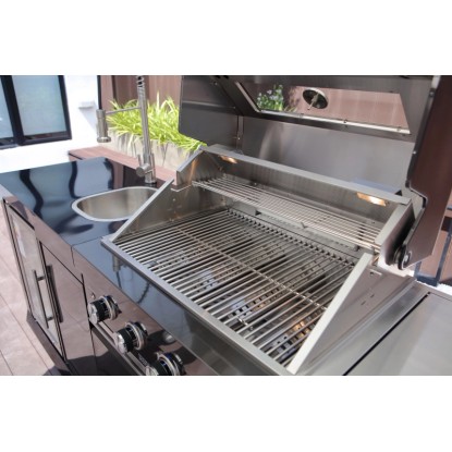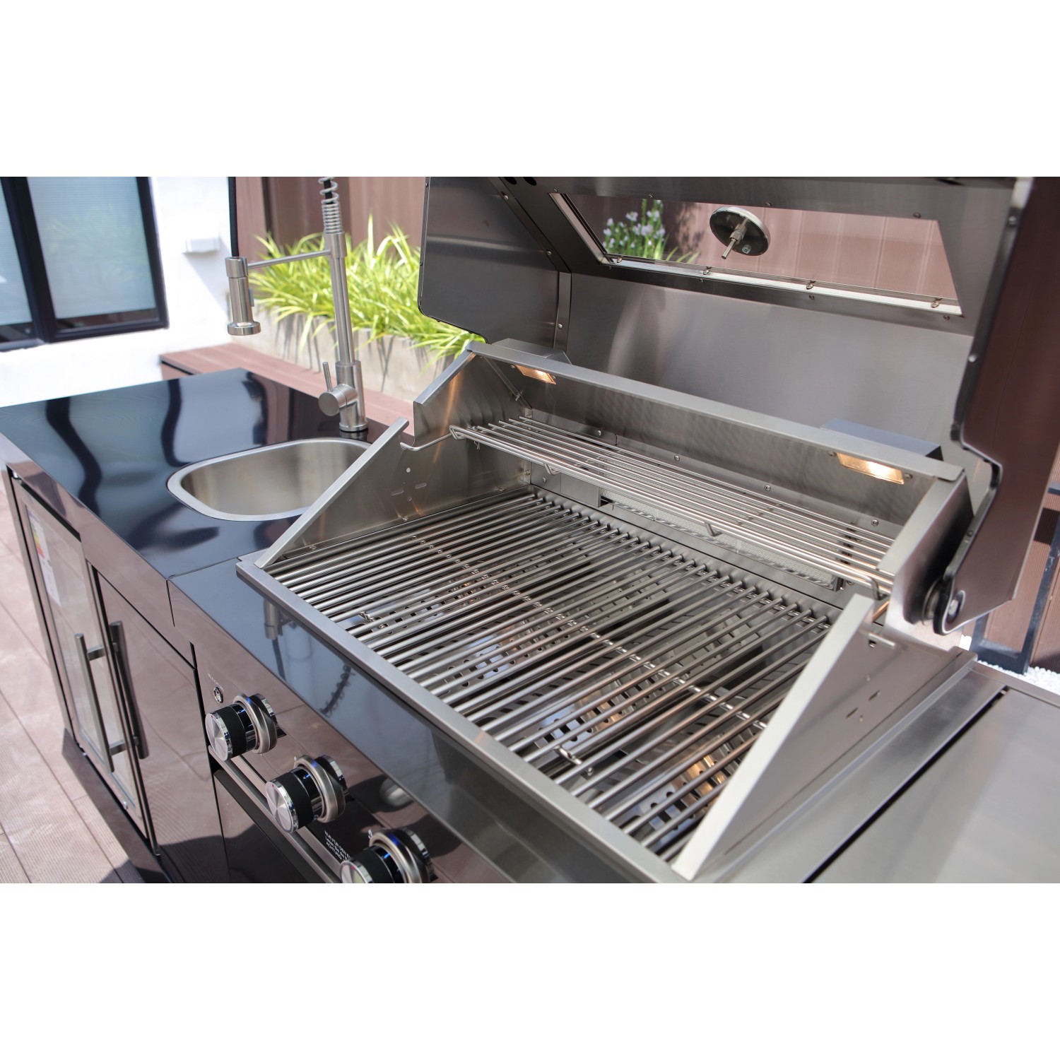 Stredom záujmu je plynový gril s nerezovým krytom, ktorý umožňuje priame alebo nepriame grilovanie. Vstavaný teplomer uľahčuje sledovanie teploty, čo znamená, že lahodné grilované pokrmy je možné uvariť k dokonalosti. Zvlášť praktický je bočný horák, na ktorom je možné pripravovať omáčky alebo prílohy, rovnako ako bočná výklopná polica pre väčší pracovný priestor. Vstavaná chladnička na nápoje a drez vrátane armatúr skvele dopĺňajú vonkajšiu kuchyňu. Za dvoma dvierkami skrine av dvoch zásuvkách je dostatok úložného priestoru pre grilovacie príslušenstvo alebo iné náčinie.