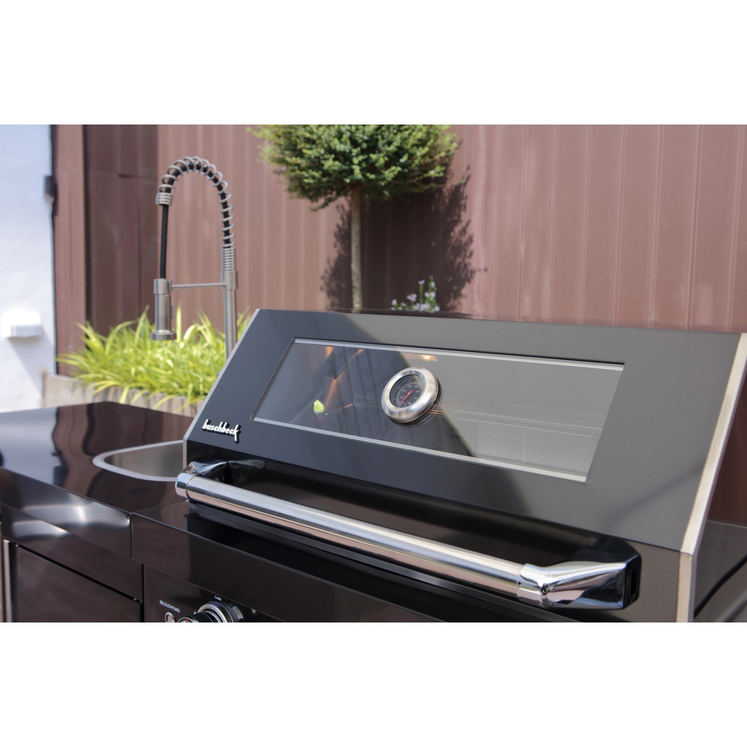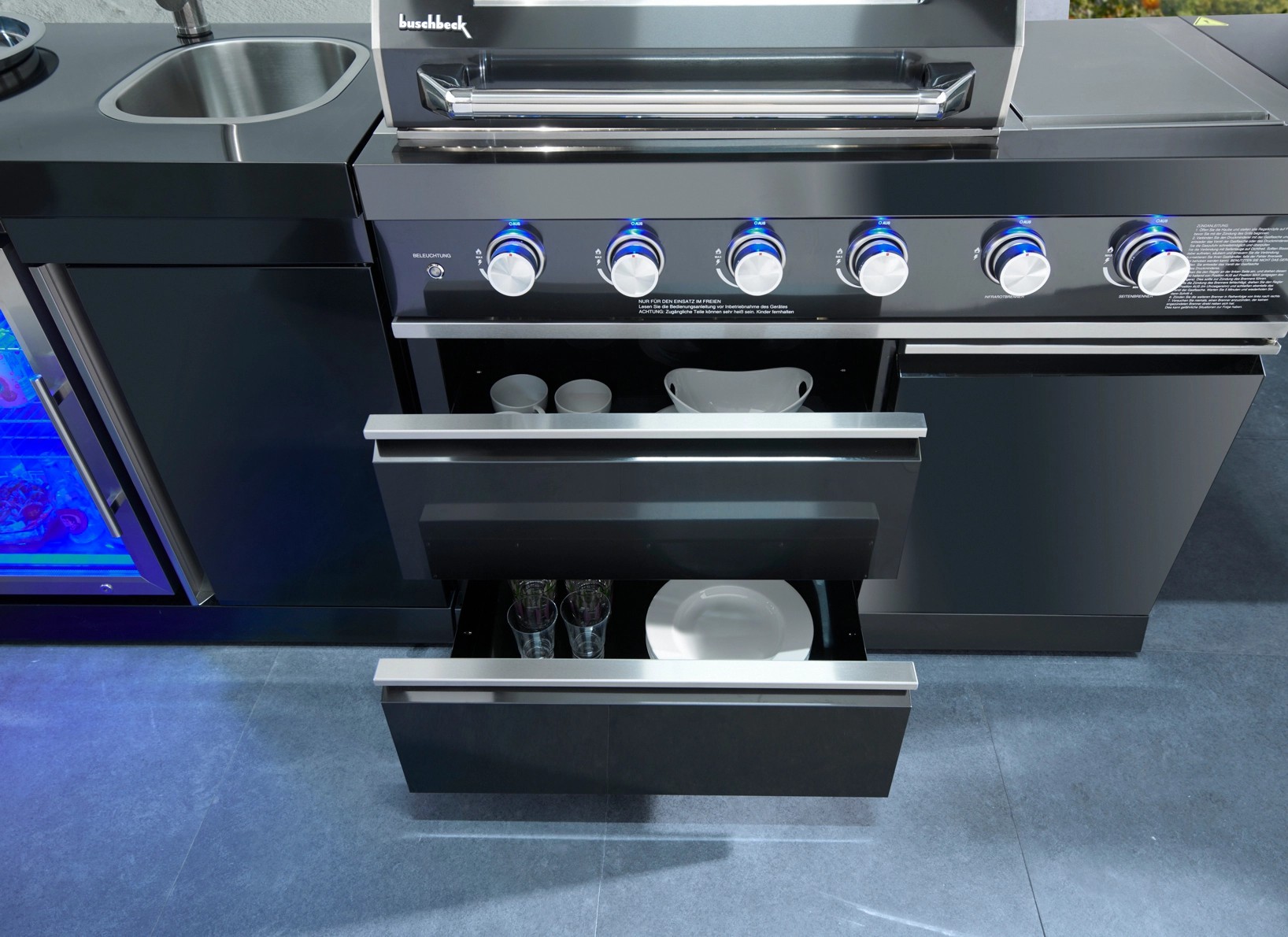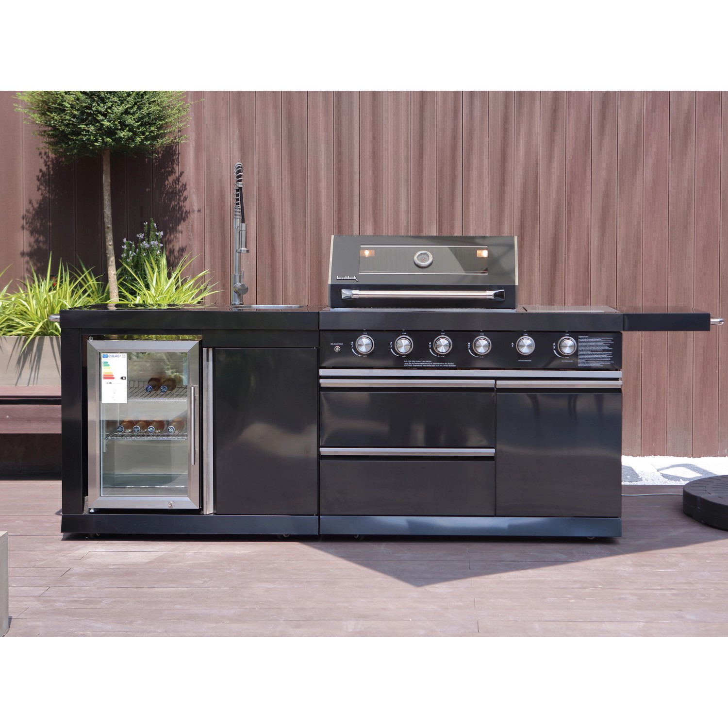 S touto vonkajšou kuchyňou Buschbeck Cambridge môžete do svojho domova vniesť viac kvality života. Vonkajšia kuchyňa Cambridge vyrobená z práškovo lakovanej ocele v čiernej farbe vyzerá nielen moderne a nadčasovo, ale má aj početné praktické funkcie.