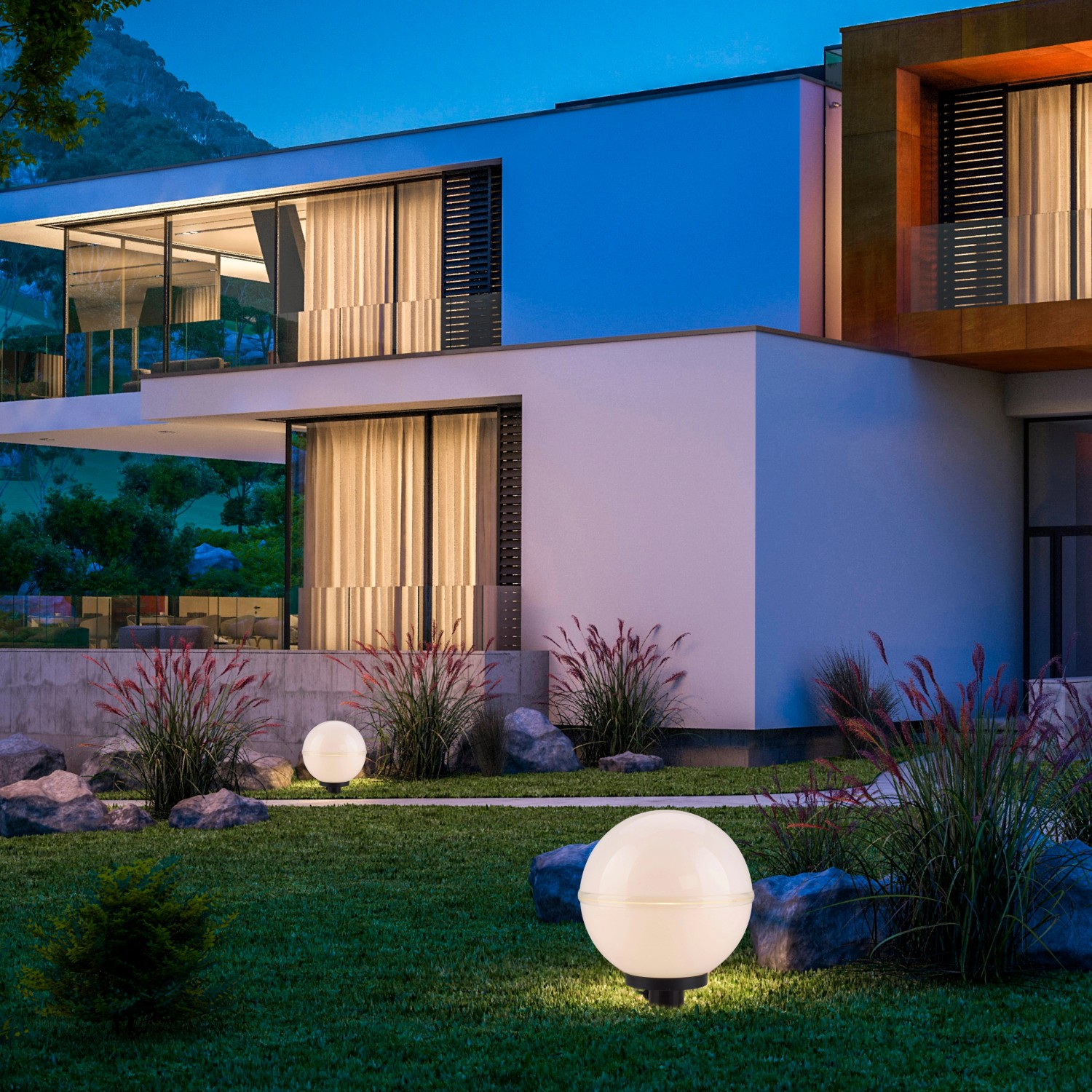 Guľové svietidlo Hemis vytvorí okolo vašej terasy, záhrady alebo balkóna krásne svetelné akcenty. Tienidlo je vyrobené z plastu a je preto veľmi robustné. Vďaka opálovému sfarbeniu navyše poskytuje príjemné osvetlenie šetrné k očiam. Svietidlo je vybavené 5m dlhým prívodným káblom a hrotom pre jednoduchú a rýchlu inštaláciu do zeme. Nechajte svoju záhradu, terasu alebo balkón zažiariť v elegantnom svetle.