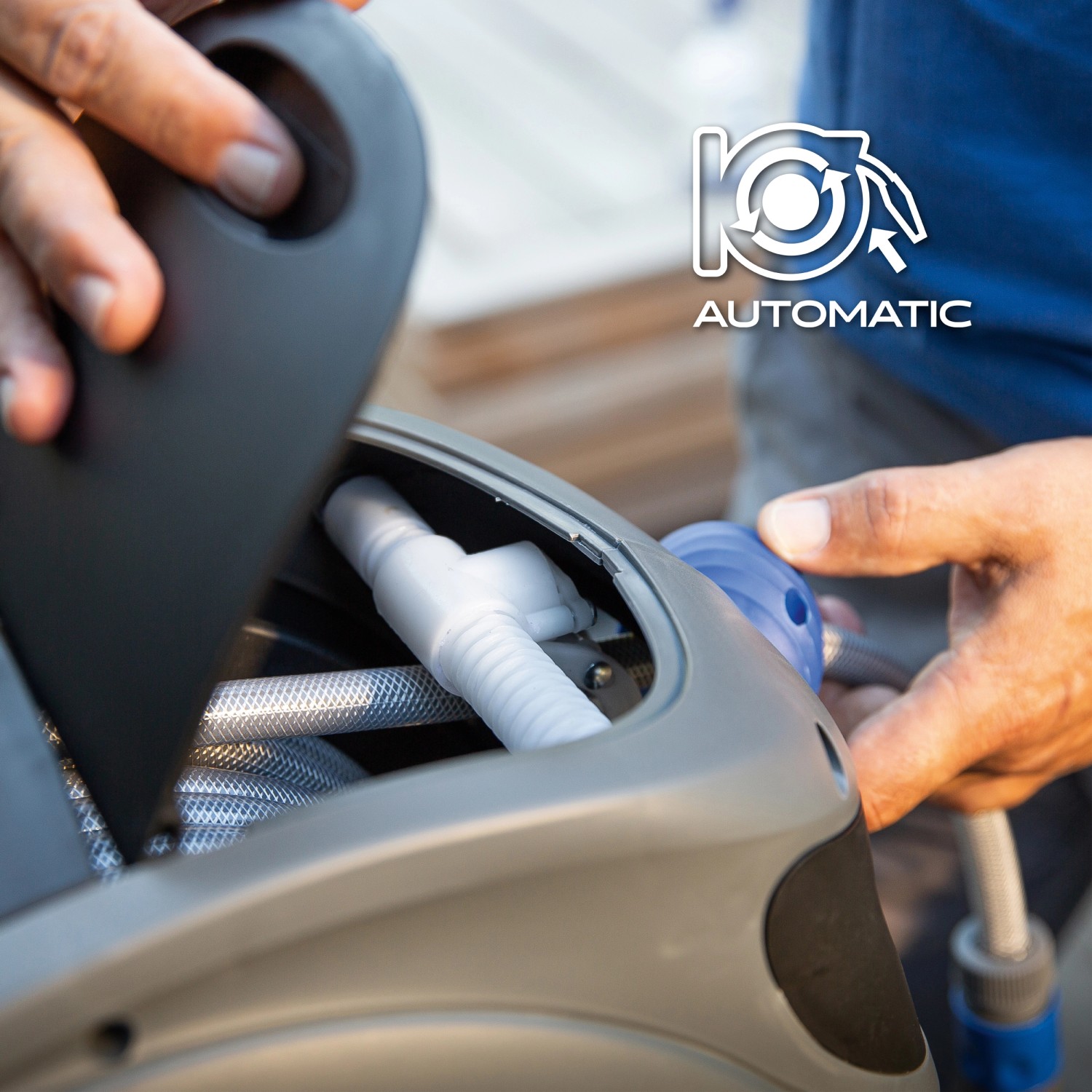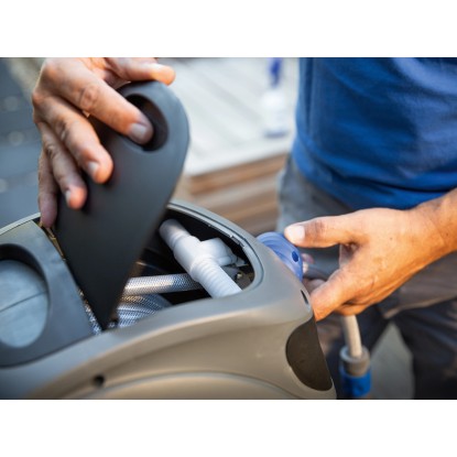 Pre pohodlnú manipuláciu je box otočný o 180°, je vybavený pomalým automatickým navíjaním hadice s revíznou klapkou a funkciou aretácie. Funkcia aretácie zafixuje hadicu v požadovanej dĺžke. Ak pri vyťahovaní hadice z bubna opatrne povolíte v ťahu, funkcia aretácie sa aktivuje. Ak chcete deaktivovať funkciu aretácie a hadicu znovu navinúť, krátko ju povytiahnite asi o 20 cm. Hadicu veďte pri navíjaní, aby nedošlo k poškodeniu bubna.
