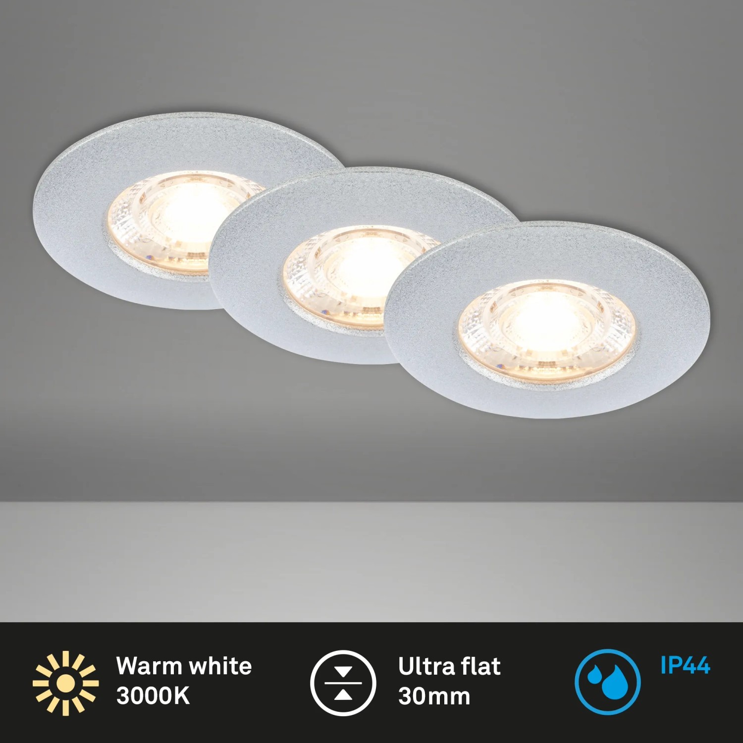 Výhodná súprava 3 ks vstavaných svietidiel od BRILONER. Tieto vstavané svietidlá sú jednoduché a moderné, a vďaka svojmu nadčasovému dizajnu so stupňom krytia IP44 zapadnú do miestností s vlhkým prostredím. Sú vyrobené z plastu a odolné voči striekajúcej vode. Jednotlivé LED moduly môžete individuálne ovládať a prispôsobiť ich svojim potrebám. Svietidlá sú vybavené LED svetelným zdrojom s výkonom 3,6 W, svetelným tokom 340 lm a svietia teplou bielou farbou svetla v chromatičnosti 3000 K.