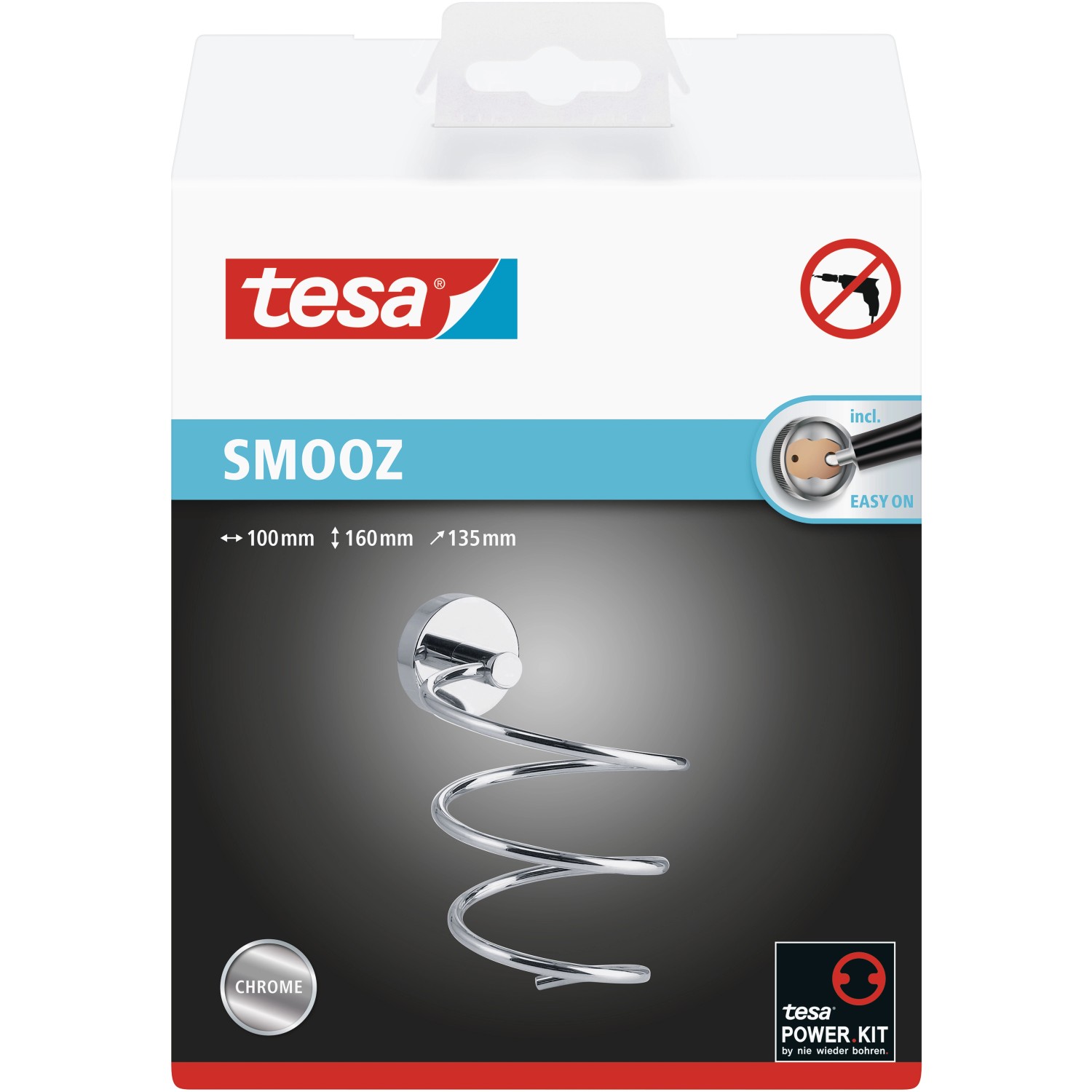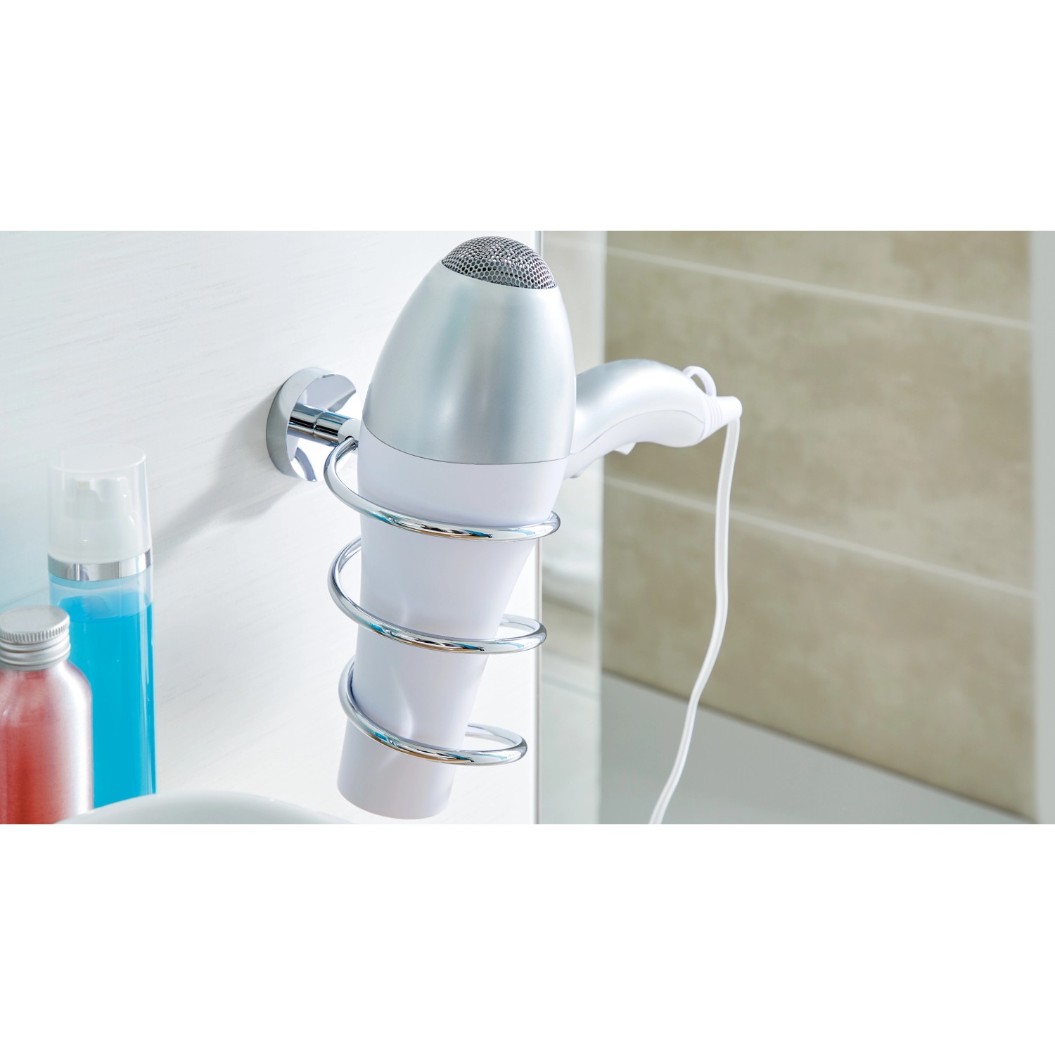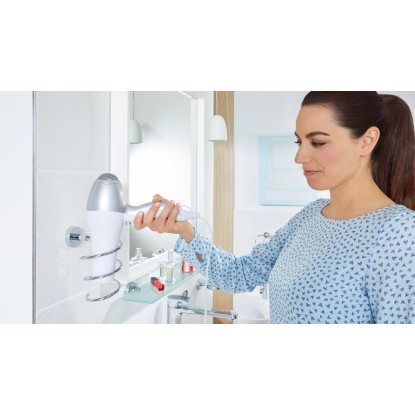 Držiak na fén tesa Smooz je vhodným doplnkom do vašej kúpeľne, vďaka ktorému máte fén vždy po ruke. Jeho zaoblený špirálovitý tvar je elegantný a zdôrazňuje ho vysoko lesklý chrómovaný povrch.