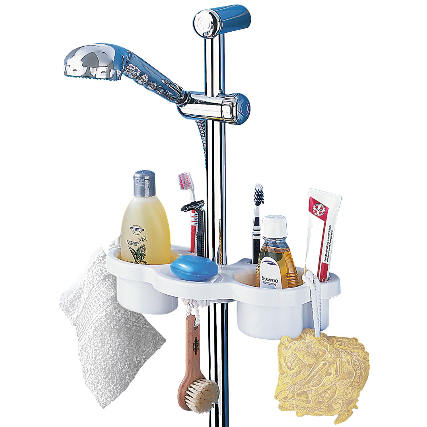 Držiak je vhodný pre všetky na trhu ponúkané sprchové tyče, a to vďaka nastaviteľnému zámku. Plastový, moderný dizajn Vám ušetrí v sprche miesto. Jednoducho držiak pripevnite na sprchovú tyč - bez vŕtania alebo skrutkovania. Držiak sa skladá z dvoch priehlbín, vhodných pre sprchcový gel, šampón a pod., zabudovanej mydelničky a dvoch držiakov na umývacie hubky apod.