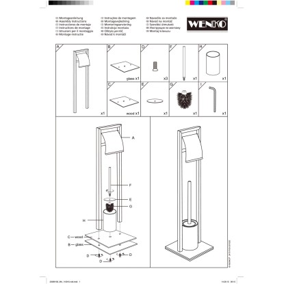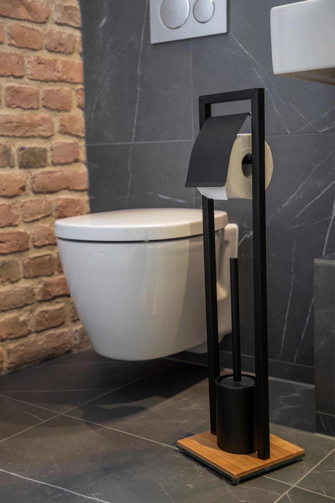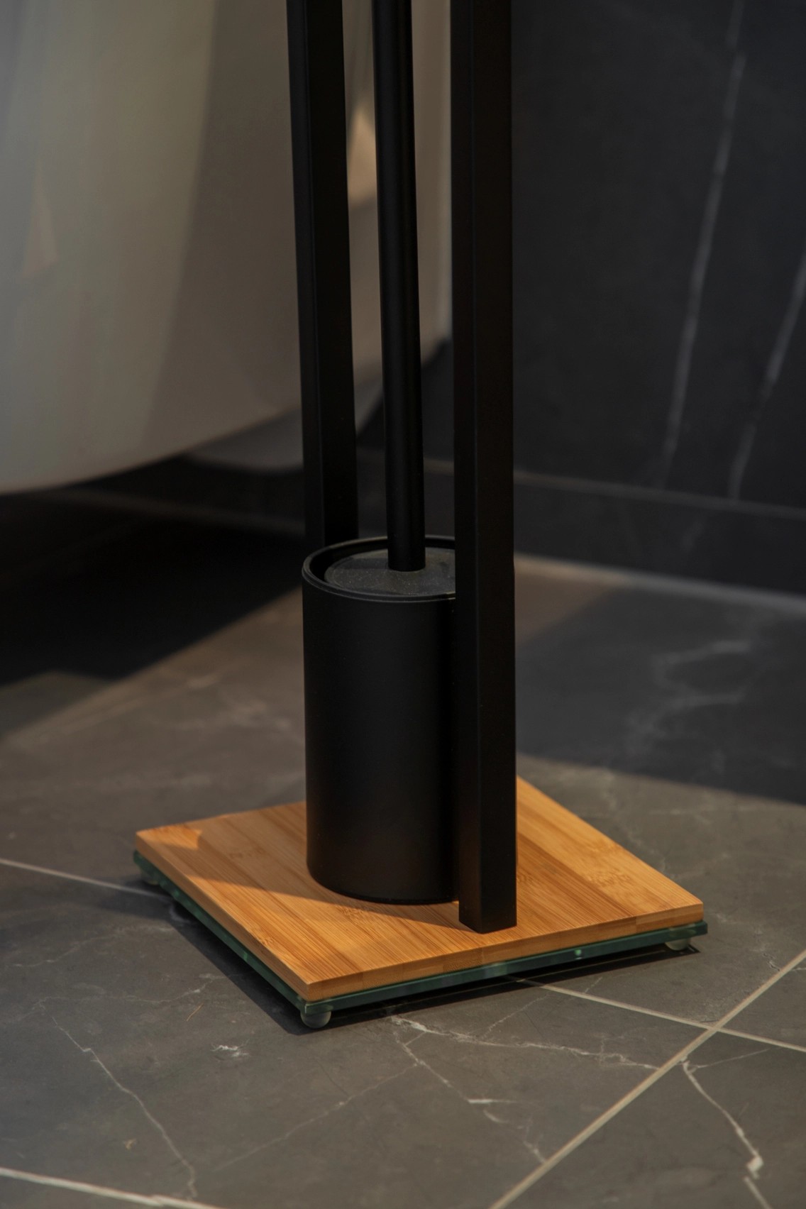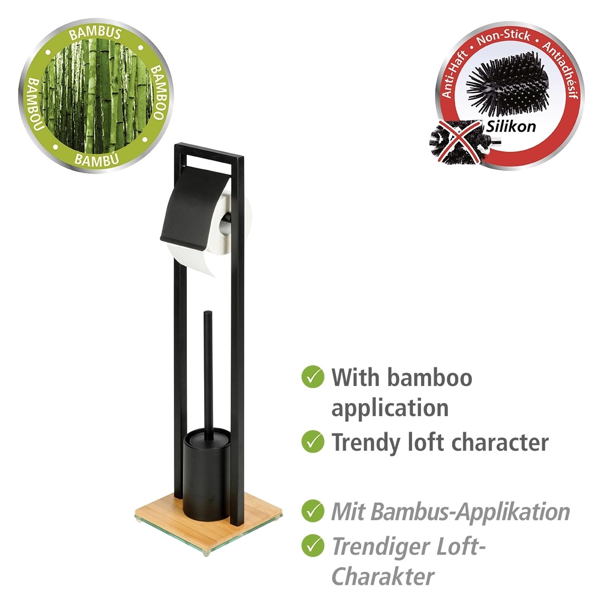 Držiak WC štetky a toaletného papiera je vyrobený z matnej čiernej nerezovej ocele v kombinácii s bambusovým podstavcom. Ťažká sklenená podložka pod podstavcom zabraňuje prevrhnutiu. Držiak WC papiera s vekom je umiestnený v dostatočnej výške nad WC štetkou. WC kefa je opatrená uzáverom držiaka pre elegantný vzhľad. Čierna hlavica štetky s priemerom 7,5 cm je vyrobená zo silikónu, ktorý odpudzuje nečistoty, a je možné ju vymeniť.