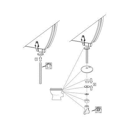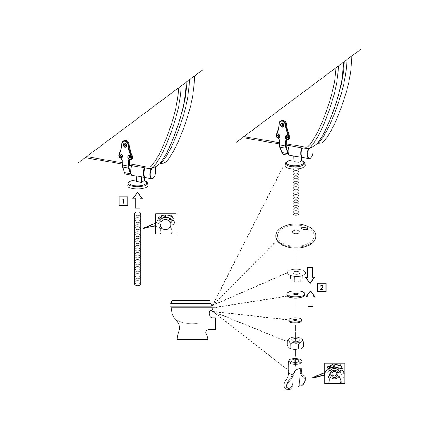 WC sedátko ľahko pripevníte pomocou závitových tyčí, ktoré zasuniete do určených držiakov. Tesnenie a skrutky potrebné na upevnenie sú súčasťou dodávky. Skrutky utiahnete pomocou montážneho kľúča (nie je súčasťou balenia, k dispozícii samostatne).