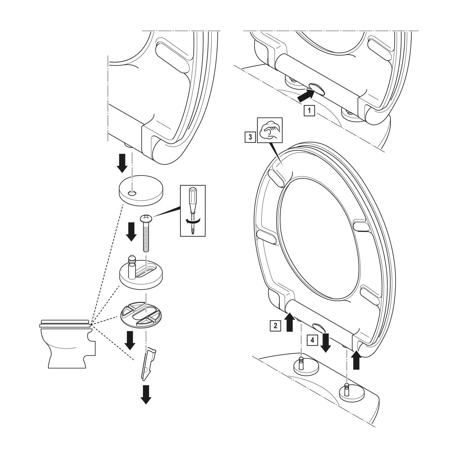 WC sedátko ľahko pripevníte pomocou závitových tyčí, ktoré zasuniete do určených držiakov. Tesnenie a skrutky potrebné na upevnenie sú súčasťou dodávky. Skrutky utiahnete pomocou skrutkovača (nie je súčasťou balenia, k dispozícii samostatne).
