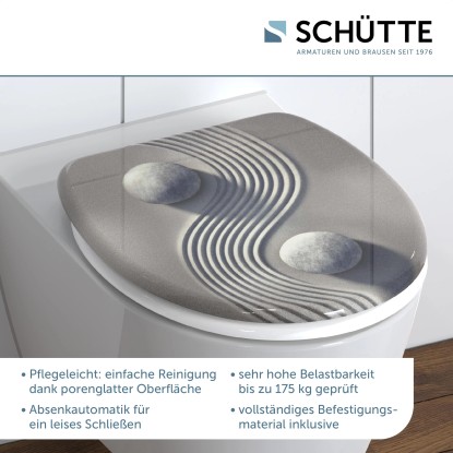 Schütte WC doska z duroplastu Jin a Jang presvedčí mimoriadnym motívom a zaručenie upúta, či na hosťovskej toalete alebo v kúpeľni. Moderná WC doska z vysokokvalitného duroplastu presvedčí aj svojou funkčnosťou. Je vybavená spúšťacou automatikou, ktorá zaručuje jemné a nehlučné zatváranie veka a dosky. Doska má štandardnú veľkosť a hodí sa takmer na každú bežnú WC misu. Duroplast s extrémne tvrdým povrchom je nerozbitný a mimoriadne odolný proti poškriabaniu, pričom zaručuje dlhú životnosť. Vďaka neporéznemu povrchu umožňuje doska súčasne aj veľmi jednoduché čistenie. Vďaka pribalenej kompletnej montážnej súprave a ľahko zrozumiteľnému návodu na montáž bude inštalácia pre vás hračkou.