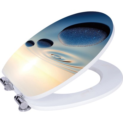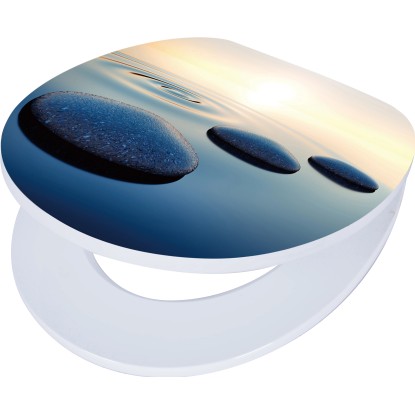 WC doska Iguasi má vo vnútri masívne drevené jadro z MDF, vďaka čomu je veľmi stabilná. Na kryte je zobrazený motív s kameňmi vo vode. Dekór je chránený viacnásobným prelakovaním a má akrylový povrch, ktorý je odolný proti vlhkosti a jednoducho sa čistí. Pánty z robustného kovu sa starajú o bezpečné a trvácne spojenie medzi doskou a vekom. WC doska je okrem toho vybavená automatickým sklápaním, kryt sa jednoducho a pomaly zatvára. Doska má nosnosť až do 150 kg. Upevňovací materiál na montáž je súčasťou dodávky.