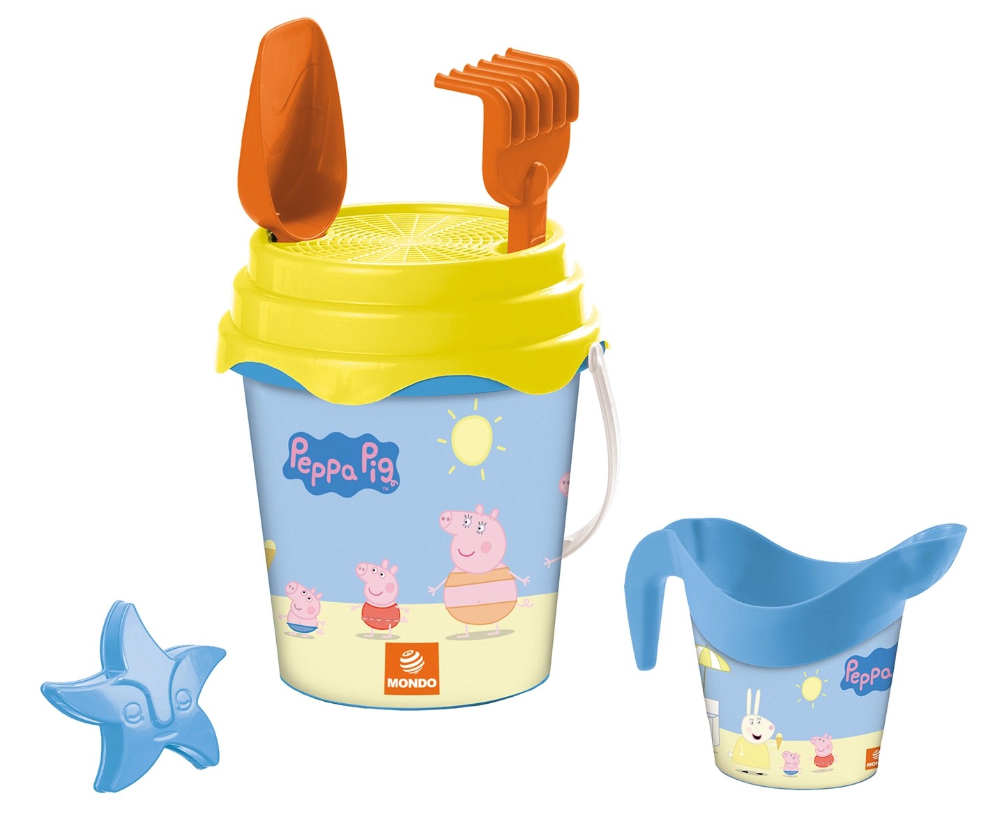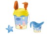 S Mondo 6-dielnou vedierkovou sadou na piesok s dizajnom prasiatka Peppa má Vaše dieťa všetko, čo potrebuje pre pekný deň na pláži. Sada sa skladá z vedra, lopatky, sitka, hrabličiek, bábovky a kanvy na zalievanie. Všetky diely sú vyrobené z plastu. Vedierko má zaoblený horný okraj bez ostrých hrán.