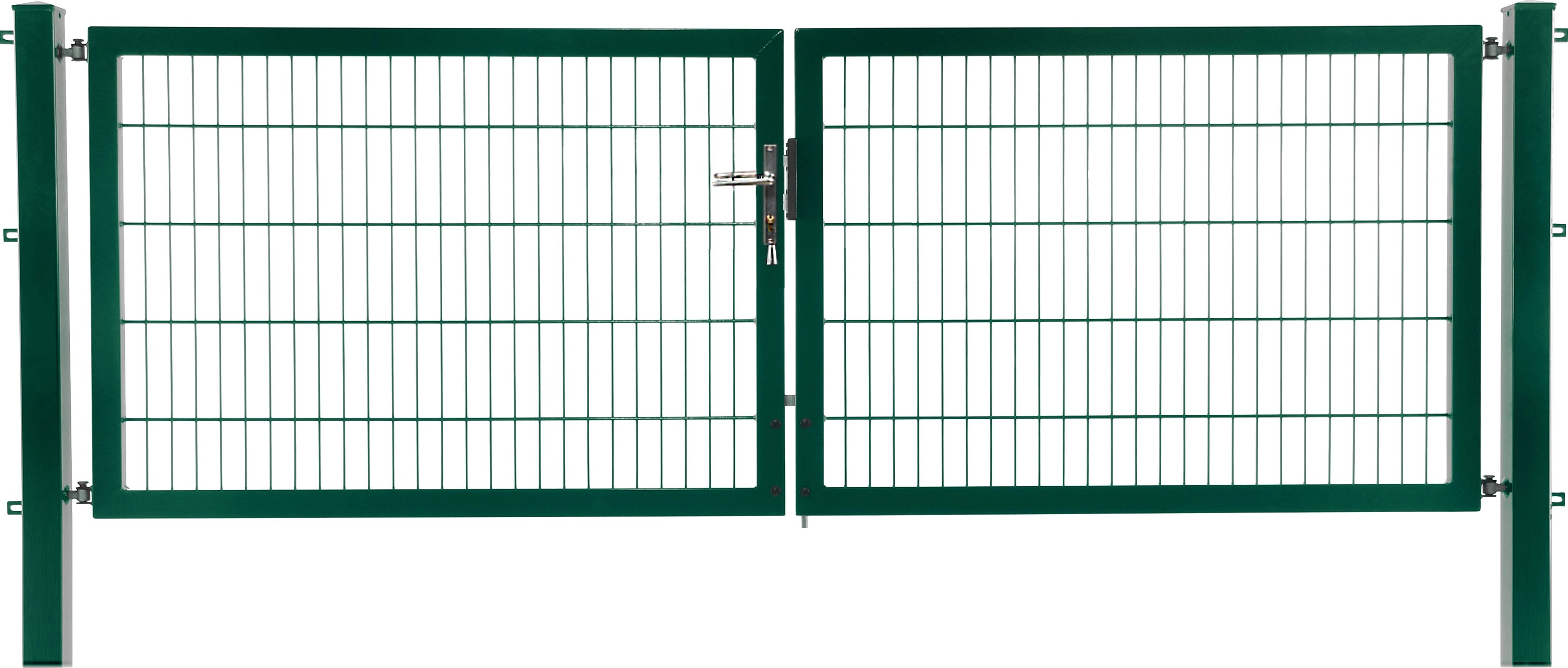 Vysoko kvalitná dvojkrídlová plotová brána Premium sa dodáva so stĺpikmi so štvorhranným prierezom 80 x 80 mm a dvojitým zváraným pletivom 200 x 50 mm. Všetky brány sa dodávajú ako kompletné riešenie s dvomi bránkovými stĺpikmi, kovaním brány s rukovätmi, zámkom a kľučami. Povrch je pozinkovaný a preto spoľahlivo chránený proti hrdzi.