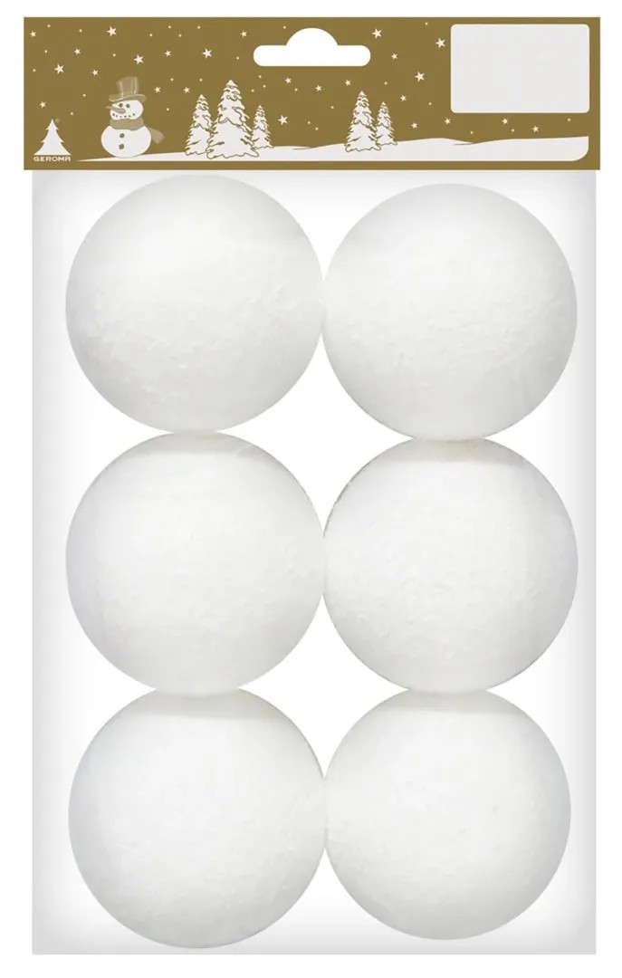 Dekoratívne vianočné snehové gule z polystyrénu v bielej farbe na zavesenie alebo položenie. Snehové gule majú priemer 6 cm a hodia sa do každej vianočnej dekorácie, či už na slávnostnú tabuľu alebo na vianočnom stromčeku. Pomocou týchto snehových gulí vykúzlite vo svojom domove zimnú atmosféru. Balenie obsahuje 6 kusov.