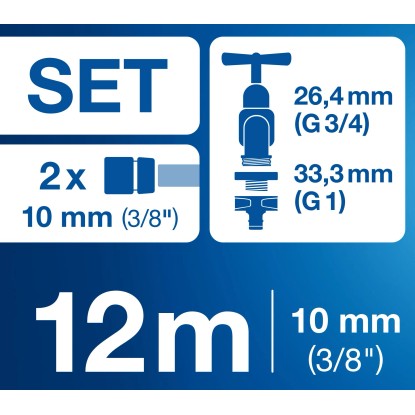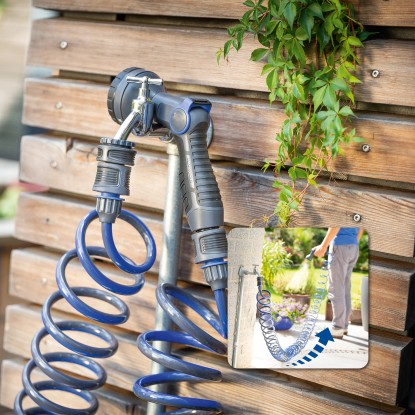 Súčasťou súpravy je ďalej špirálová hadica, ktorú je možné roztiahnuť až na dĺžku 12 ma ktorá sa po použití opäť samočinne úsporne stiahne. Má priemer 10 mm (G 3/8"). Záhradná hadica je na oboch stranách vybavená rýchlospojkami na 33,3 mm (G 1), ktoré sú kompatibilné so všetkými bežnými nástrčnými vodovodnými systémami. Bezpečné pripojenie k vodovodu zaisťuje vhodný kohútikový adaptér o rozmere 26,4 mm (G 3/4). Použité diely sú vyrobené z vysoko kvalitných plastov s odolnosťou voči UV žiareniu a mrazu.