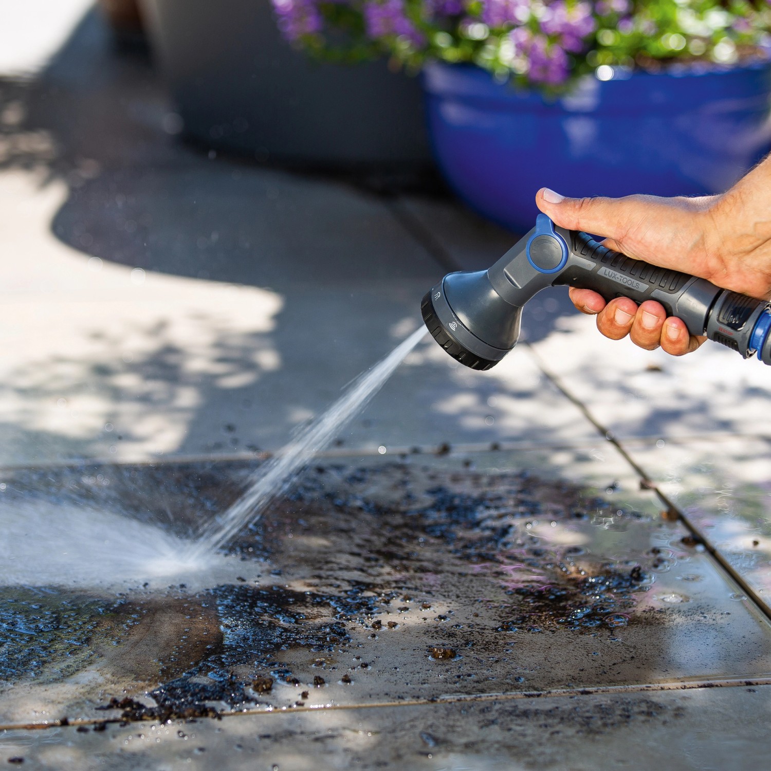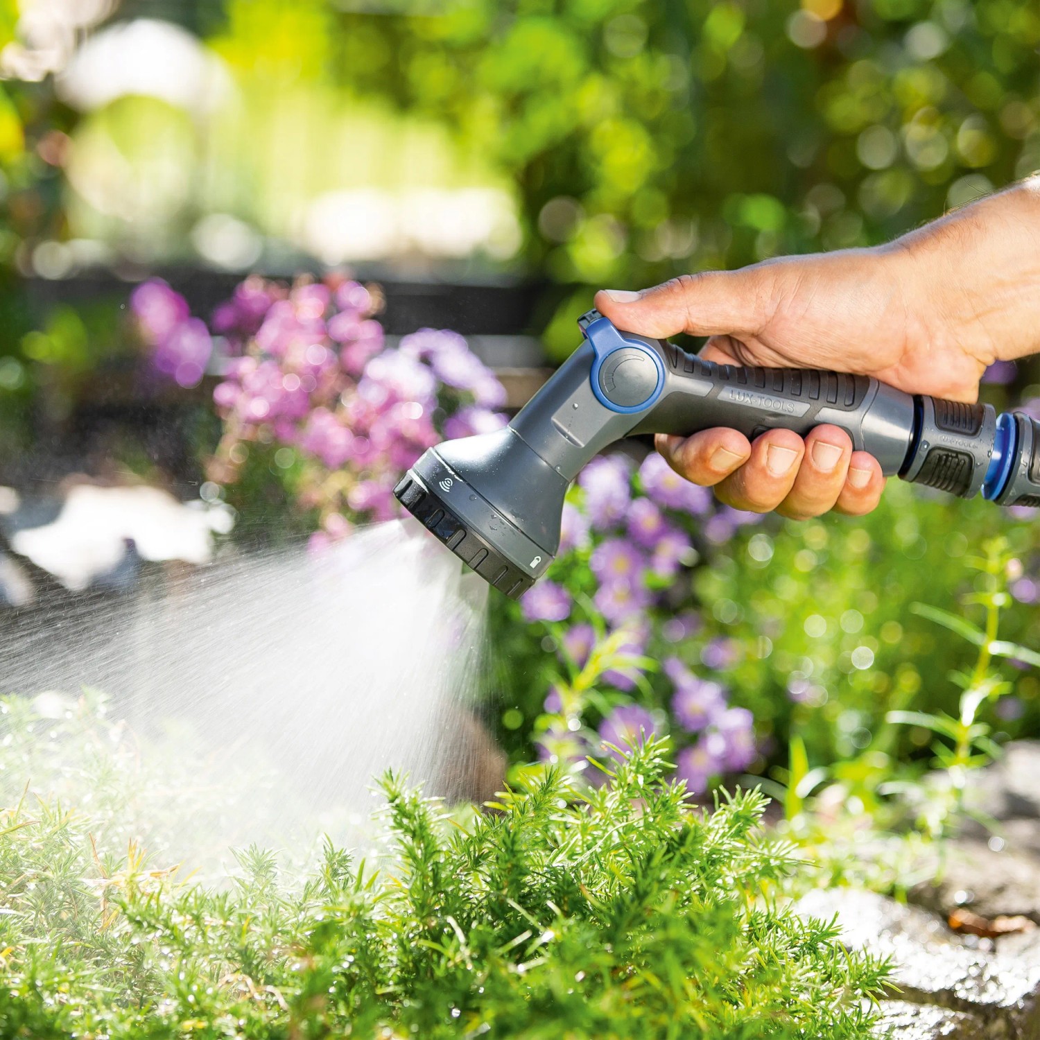 Viacúčelová sprchová súprava značky LUX TOOLS umožňuje flexibilné zavlažovanie záhrady. Môžete ju použiť na záhony s úžitkovými alebo okrasnými rastlinami a na čistenie. Sprcha disponuje piatimi rôznymi typmi prúdu vody, ktoré je možné prepínať pomocou otočnej hlavy. Vďaka tomu môžete plynule nastaviť požadovanú intenzitu prúdu. Vyberte si napríklad medzi prúdom sprchy, jemnou hmlou alebo silným, plným prúdom. Pomocou páky na hlave rukoväte môžete nastaviť intenzitu medzi nulou a maximom av prípade potreby aretovať.
