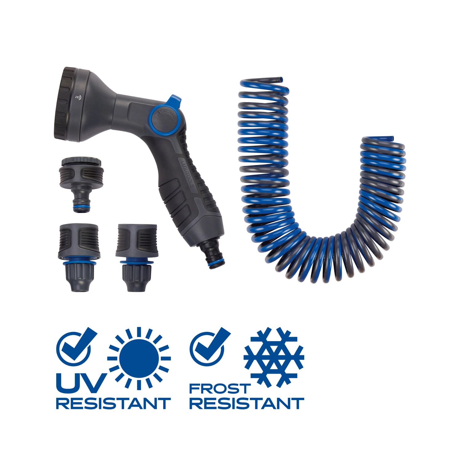 LUX-TOOLS Súprava záhradnej sprchy so špirálovou hadicou, 5 prúdov