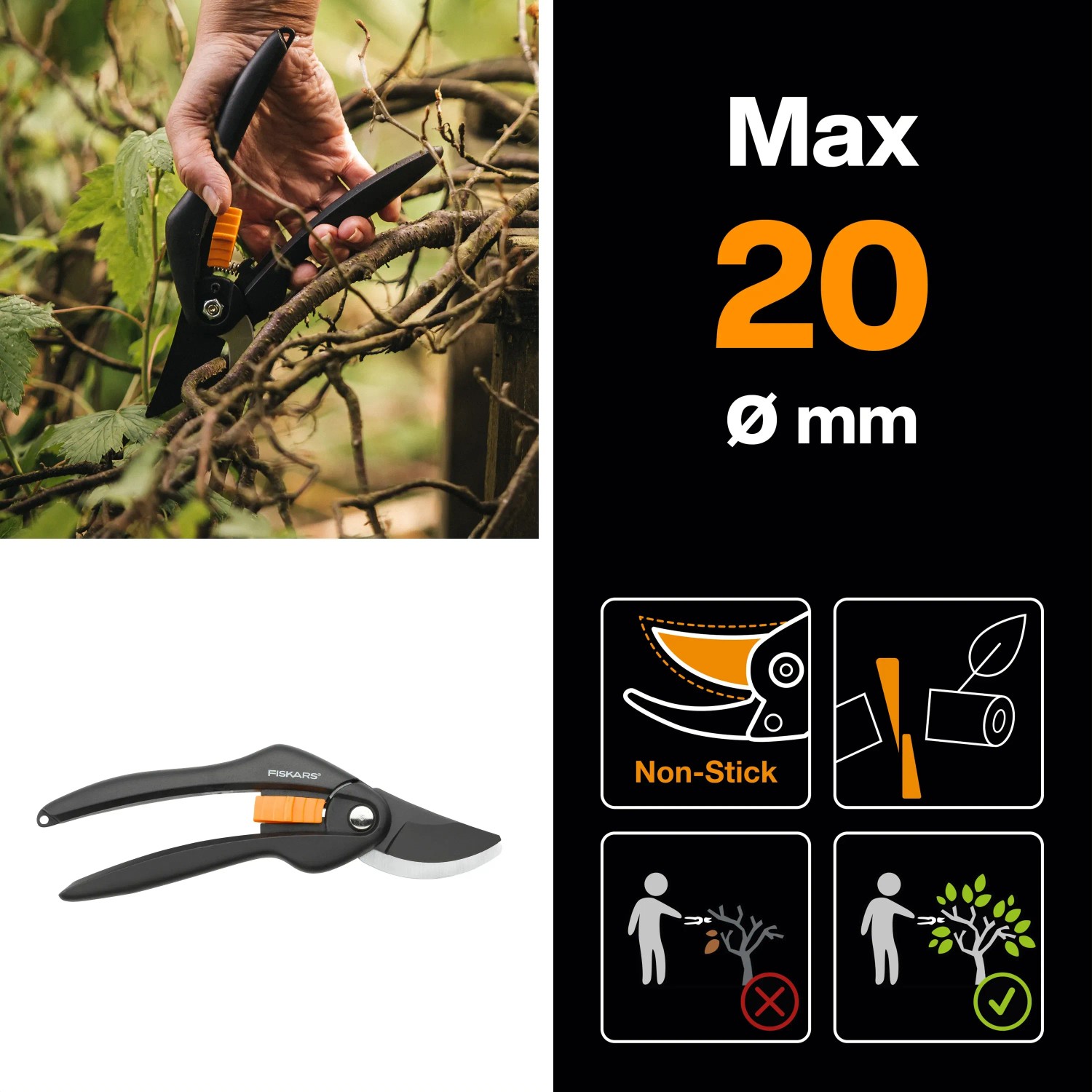 Jednoručné dvojčepeľové záhradné nožnice FISKARS P26 sú navrhnuté pre čo najvyššiu ergonómiu, komfort a jednoduchosť používania a vďaka tomu sú mnohí experti aj lajky hodnotené ako najlepšie vo svojej kategórii. Ergonomicky tvarované držadlá sú vyrobené z extra pevného polyamidu. Čepele z vysoko kvalitnej karbónovej ocele sú v nepracovnej polohe bezpečne zaistené vďaka ľahko prístupnému zámku. Nožnice FISKARS P26 sú vhodné na strihanie čerstvých vetiev až do priemeru 20 mm. Vďaka nepriľnavému povrchu PTFE horná čepeľ umožňuje ľahšie strihanie a čistenie.