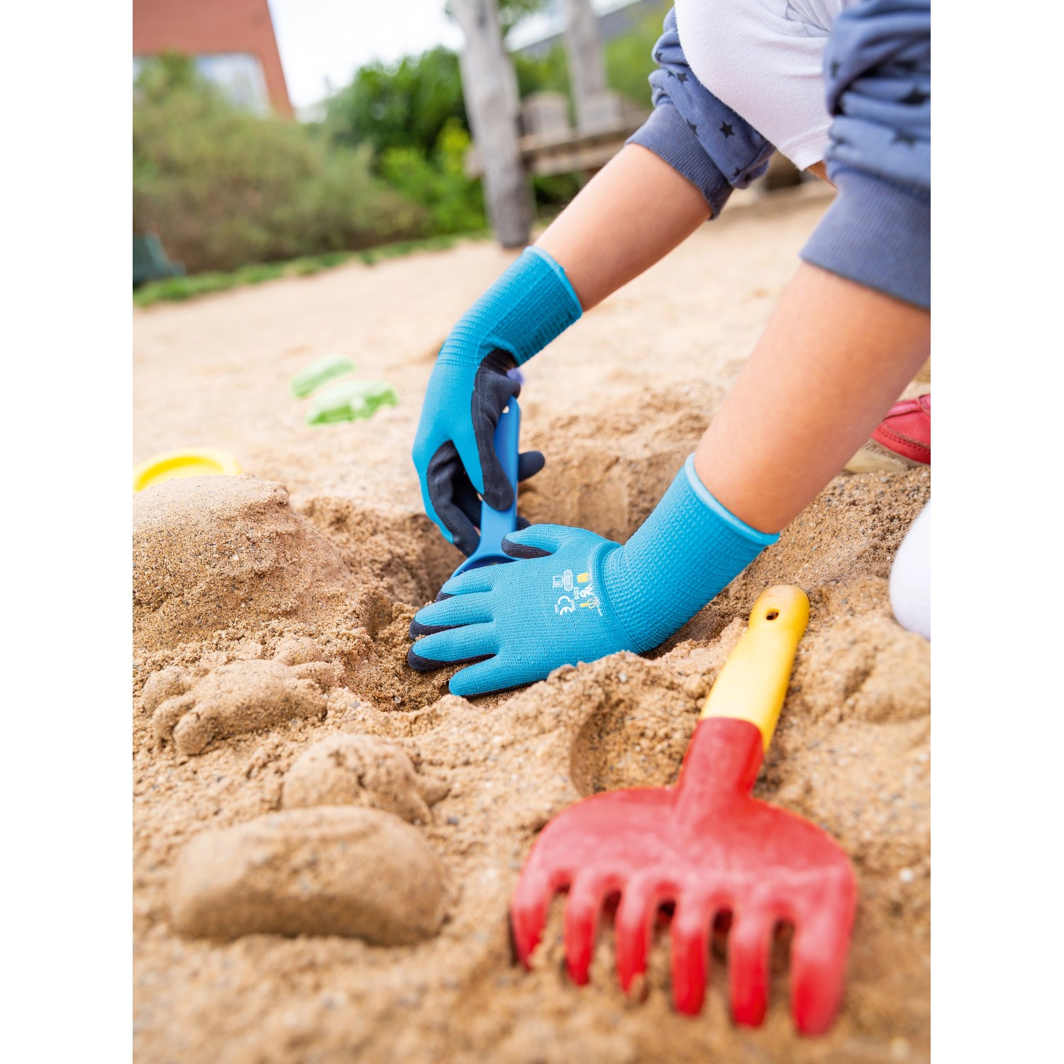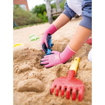 Bezšvíkové, jemne pletené detské rukavice na hrubé práce na záhrade a tiež na použitie na pieskovisku. Veľkosť 4 je určená pre deti od 4 do 6 rokov. Pružné rukavice majú kvalitnú povrchovú úpravu z prírodného latexu, ktorý odpudzuje vodu, je vysoko priľnavý a protišmykový.