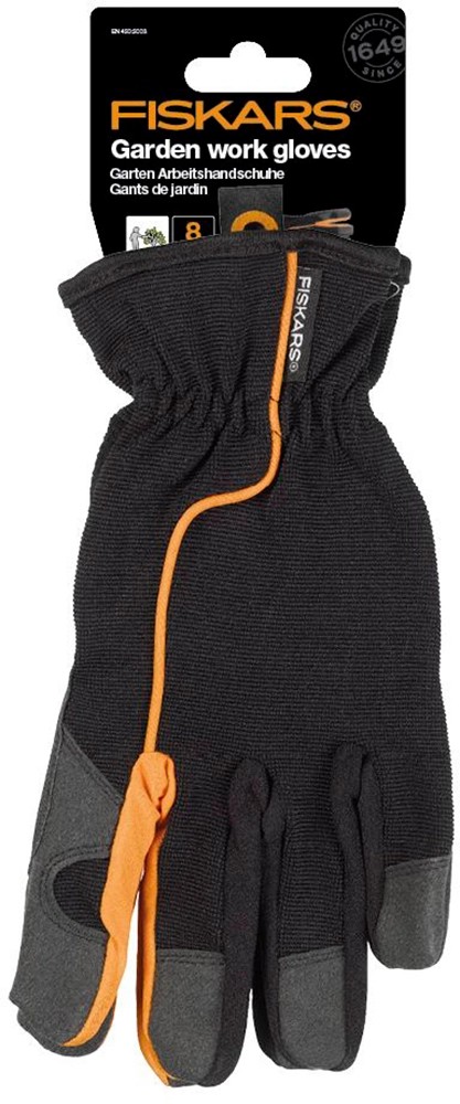 S novými záhradnými pracovnými rukavicami značky Fiskars máte všetko pod kontrolou. V kombinácii s protišmykovými držadlami zariadení značky Fiskars poskytujú nové záhradné rukavice optimálne uchopenie a chránia okrem toho ruky proti dreveným trieskam a chladu. Vnútorná plocha ruky disponuje odolnou a protišmykovou povrchovou úpravou. Vďaka malým medzerám sa povrchová úprava pri zatvorení ruky nevlní. Rukavice tak všade priliehajú rovnomerne a poskytujú optimálnu možnosť uchopenia. Gumený sťahovací pás zabezpečuje vynikajúce prispôsobenie tvaru ruky a protišmyková slučka na drieku uľahčuje naťahovanie rukavíc. S priedušnou zadnou stranou, spevnenými končekmi prstov a vnútornými plochami na dlaniach. Vďaka tomu sú rukavice ideálnym spoločníkom pri všetkých prácach v lese a záhrade a obzvlášť pri príprave palivového dreva.