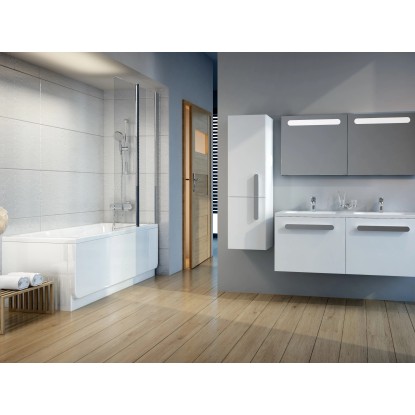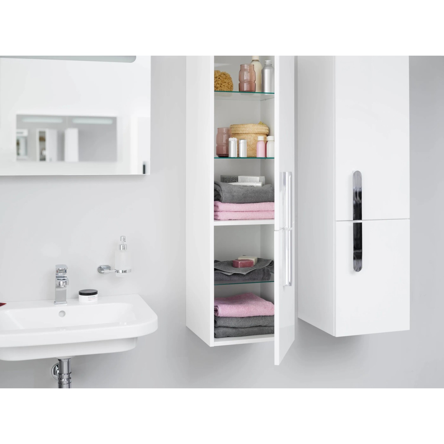 Skrinka orientovaná na výšku sa uplatní aj v menšej kúpeľni a poskytne neoceniteľný priestor pre všetky Vaše kúpeľňové potreby. Ukladanie uľahčujú tri sklenené poličky. Bočný stĺp má dvere rozdelené na hornú a dolnú časť v pomere 2/3 a 1/3. Horná časť má