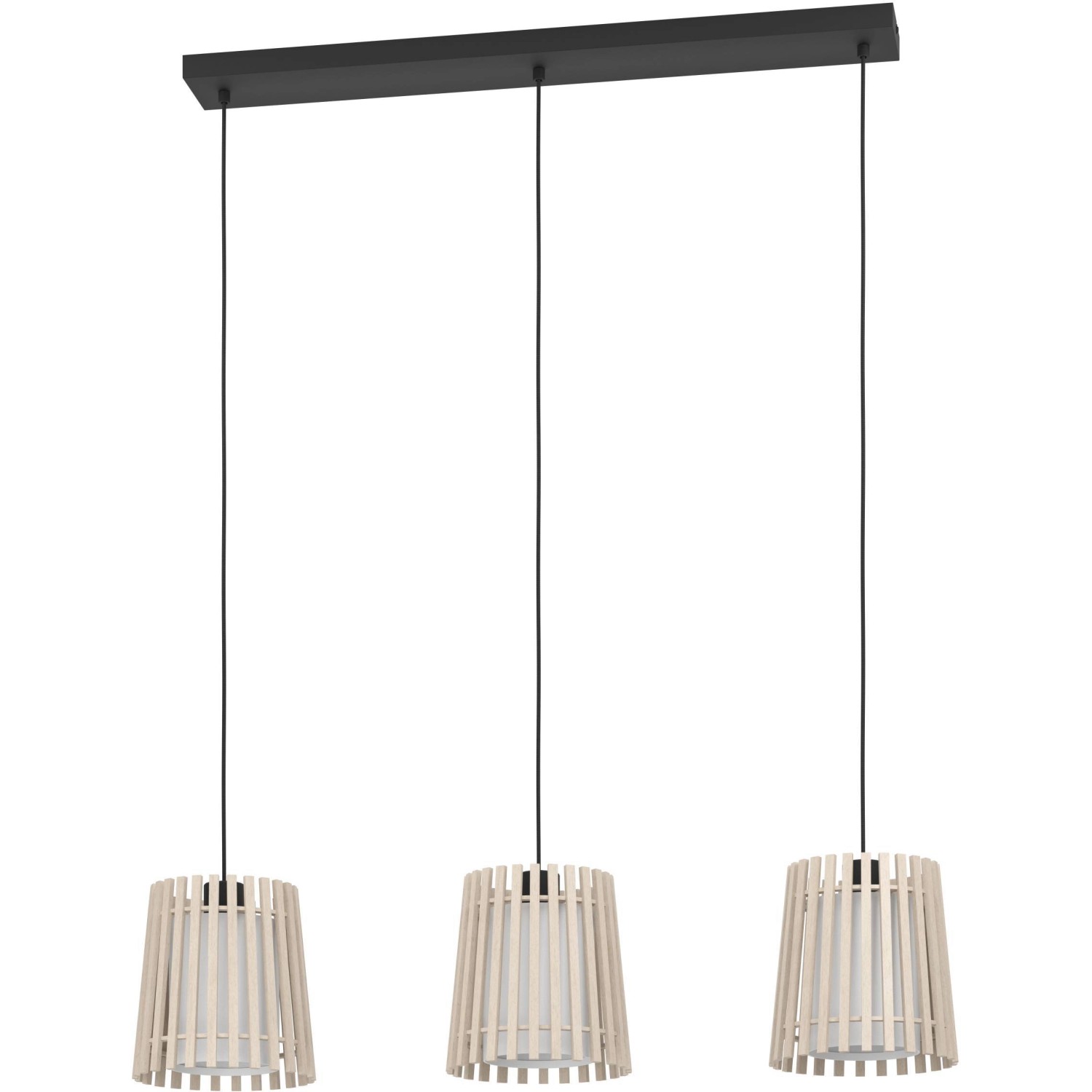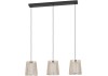 Závesné svietidlo Eglo Fattoria 3-ramenné v bielo-čierno-hnedej farbe sa skladá z troch tienidiel, z ktorých každé pozostáva z dvoch do seba zaradených tienidiel. Vonkajšie tienidlá sú vyrobené zo svetlého pravého dreva a vo vnútri majú biele textilné tienidlo. Tieto tienidlá sú pripevnené k trom čiernym textilným káblom pripevneným k podlhovastému vrchlíku v rovnakej farebnej schéme.