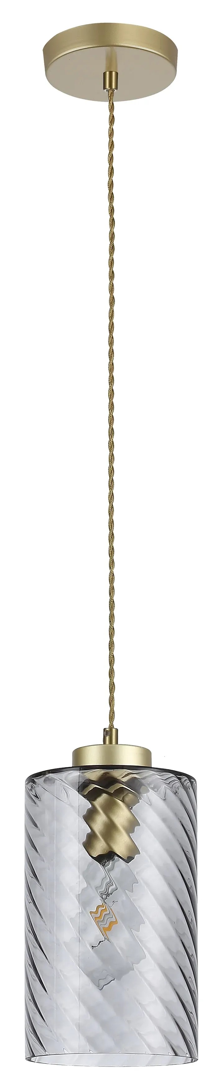 Závesné svietidlo Sheila bude skutočne elegantným doplnkom vašej modernej obývacej izby, jedálne alebo spálne. Zlaté kovové svietidlo je doplnené tónovaným skleneným tienidlom a hlava svietidla je spojená so zlatým okrúhlym ozdobným podstavcom zakrúteným textilným káblom. Povrch podlhovastého skleneného tienidla valcového tvaru evokuje vlnenie vody.