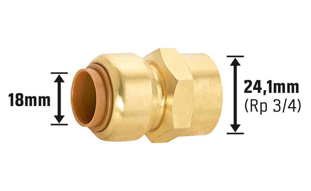Násuvná fiting navzájom spája rúrku so závitom a rúrku bez závitu. Spojovací prvok sa používa vo vykurovacích alebo vodovodných inštaláciách. Vďaka prevedeniu z mosadze je odolná voči opotrebovaniu a korózii. Povrch je hladký. Fiting má na jednom konci násuvnú objímku s priemerom 18 mm a na druhom konci závitové šróbenie s vnútorným priemerom 24,1 mm (Rp 3/4).