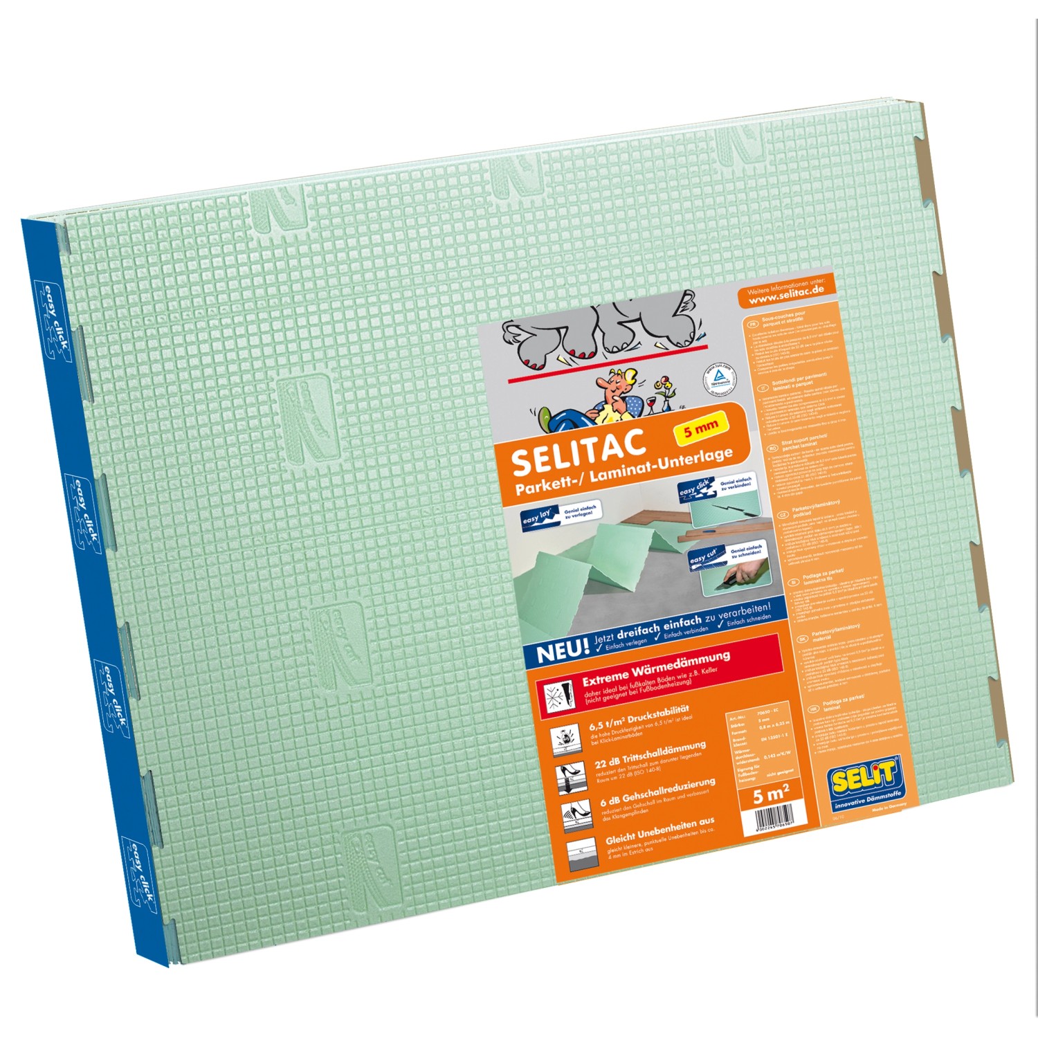 Podložka Selitac 5 mm pod drevené a laminátové podlahy je ideálna pre studené podlahy (napr. v pivniciach), ktoré vyžadujú dodatočnú tepelnú izoláciu. Podložka je vyrobená z extrudovanej polystyrénovej peny odolnej voči vysokému tlaku, ktorá zaručuje trvalú kvalitu a veľmi dobré výkonové údaje. Podložka pod drevené a laminátové podlahy zvyšuje komfort pri chôdzi a bez problémov vyrovnáva bodové nerovnosti do 4 mm. Skvele znižuje hluk pri náraze a chôdzi.