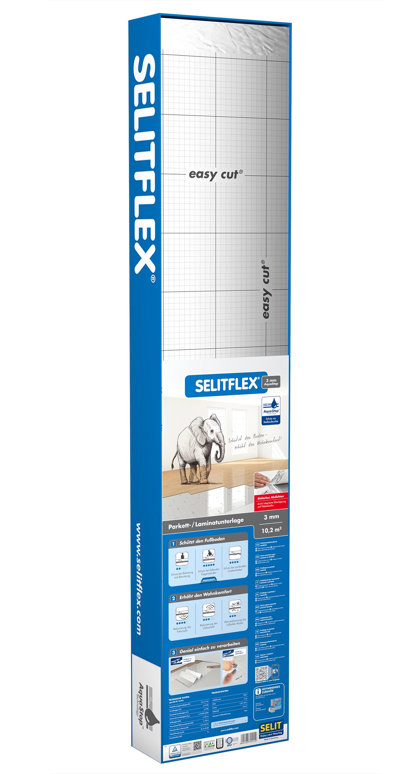 Podložka Selitflex 3 mm je určená na ochranu pred zvyškovou vlhkosťou stavby (dodatočná inštalácia polyetylénovej fólie už nie je nutná), v nájomných a poschodových bytoch na ochranu pred kročajovým hlukom (obmedzenie kročajového hluku smerom k nižšie položeným bytom), u tvrdých. hlasitých laminátových podláh (výrazné obmedzenie zvuku z chôdze) a pri malých nerovnostiach v podloží až do cca 2,5 mm. Utesnenie je ešte jednoduchšie vďaka integrovanému presahu a lepiacim pásikom.
