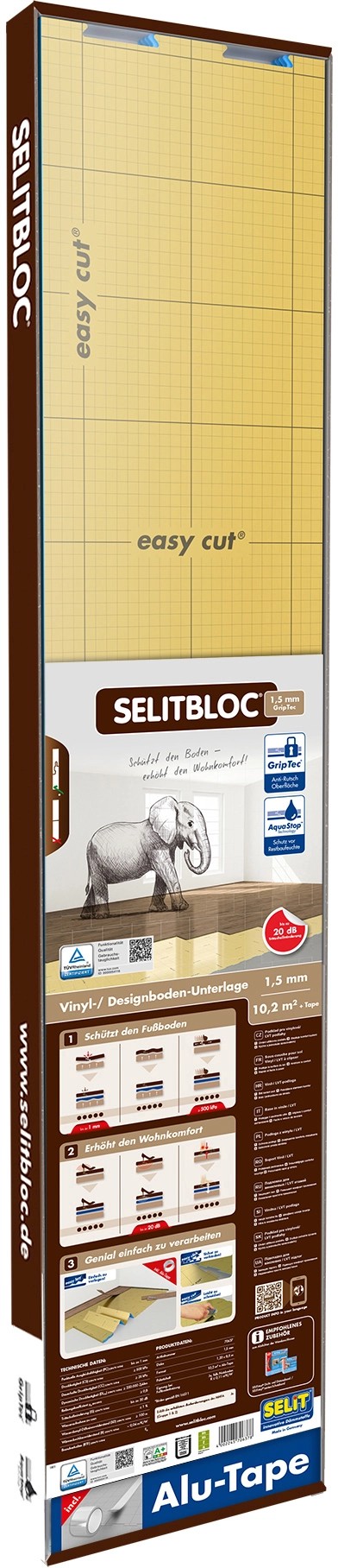 Vinylová podložka SELIT SELITBLOC GripTec s povrchom GripTec je perfektná ako podložka pod vinylové a dizajnové podlahy (LVT, SPC a RIGID) predovšetkým, keď príde na nízku inštalačnú výšku. So svojím tlakovo stabilným penovým jadrom, podložka spoľahlivo chráni podlahu pred zaťažením a poškodením, pred zvyškovou vlhkosťou vďaka AquaStop technológii a spoľahlivo vyrovnáva nerovnosti a chráni pred efektom telegrafovania. Navyše aj napriek svojej malej hrúbke, poskytuje významné zvukovo izolačné vlastnosti. Inovatívny povrch GripTech zamedzuje kĺzanie dosiek a otváranie spojov.